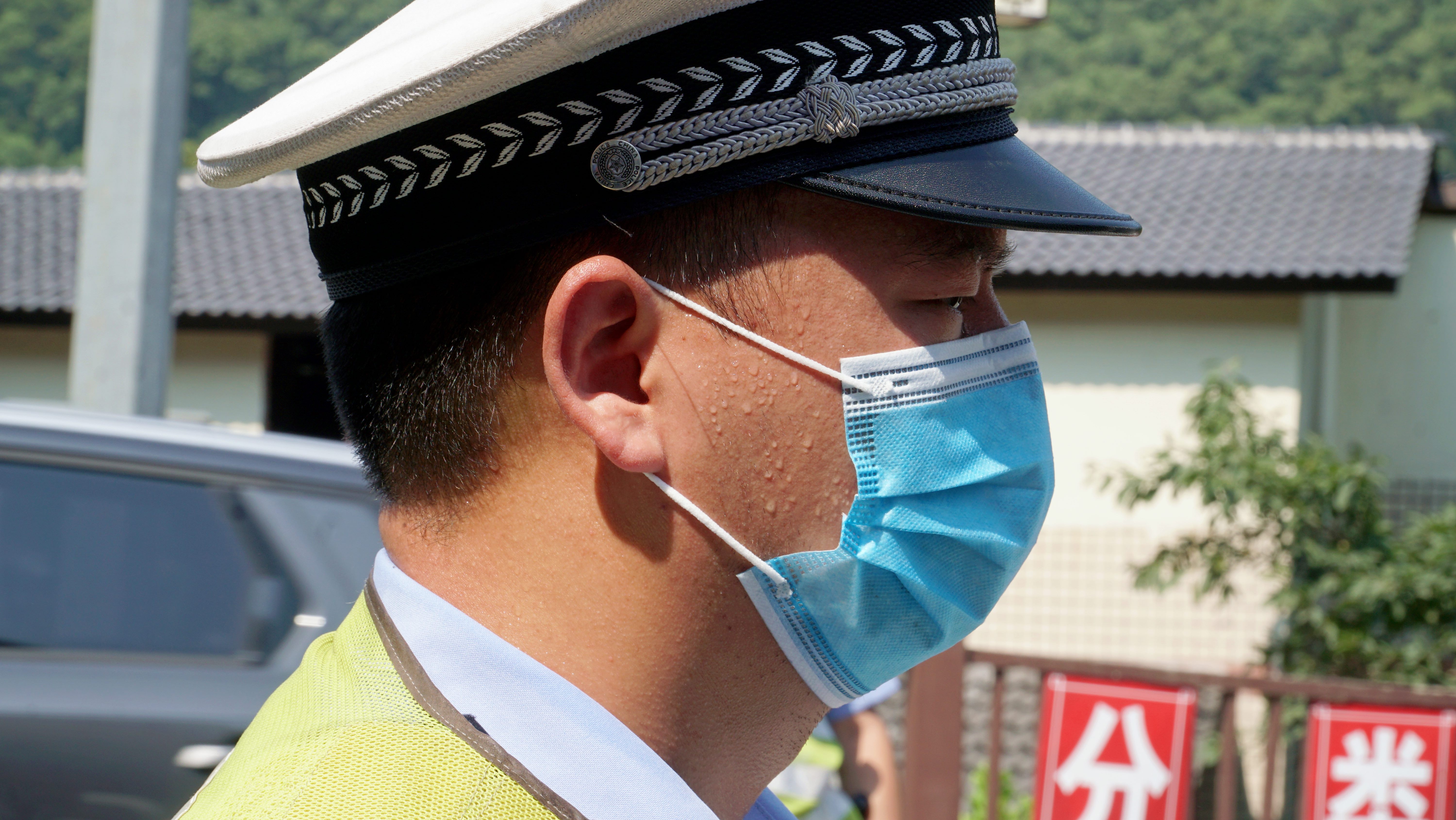 头顶烈日,感受着马路边上的高温热浪,短短十几分钟,张俊峰的警服就已湿透,脸上的汗珠一颗颗往下掉。