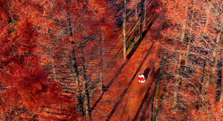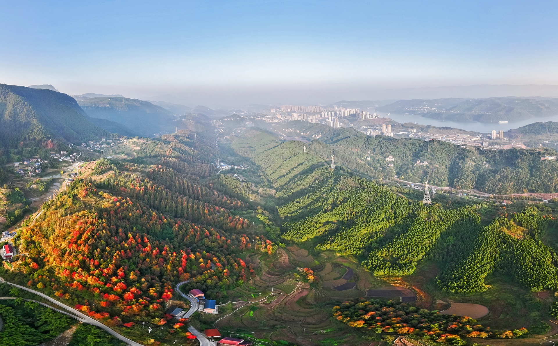 11月25日,从空中俯瞰三峡库区重庆忠县白公街道护国村境内,成片树林色彩斑斓、五彩缤纷,成为初冬时节忠县大地一道美丽风景线。