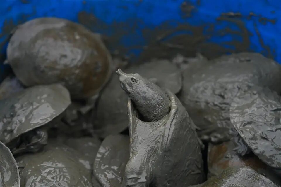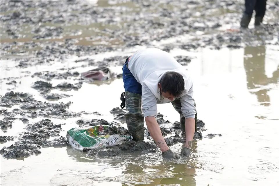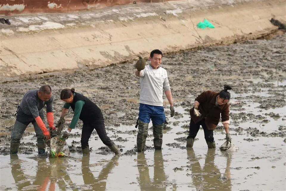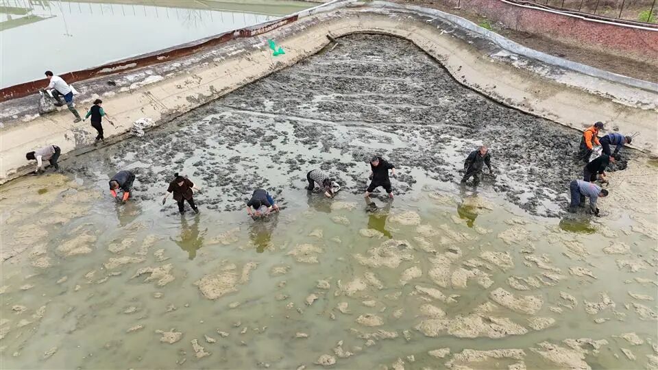 走进白鹤街道的天亿甲鱼养殖基地,一场人与泥的“较量”正在上演。工人们身穿连体防水衣,戴着手套,弯腰将双手探入池塘底部,一层层挖开淤泥,仔细摸索着藏在其中的甲鱼。
