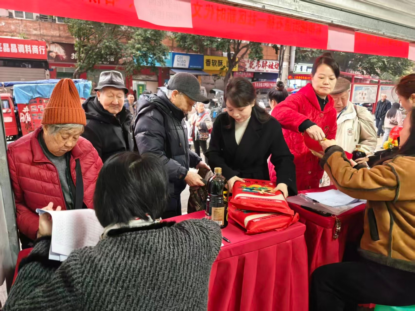 本次活动聚焦社区温情与人文关怀,特别将关爱长者作为重点环节。活动现场,社区工作人员与志愿者为辖区70岁以上的老人们送上了新春的温暖与祝福,精心准备了大米、酱油等实用生活物资作为节日礼物。老人们有序领取,笑容满面,现场洋溢着尊老敬老、温馨融洽的浓厚氛围。一份份朴实的礼物,传递的是社区对长者的深切挂念与真挚问候,切实提升了老年群体的获得感与幸福感。