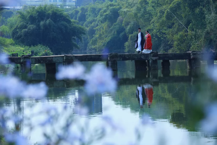 每年这个季节,菜园里菜苗青翠欲滴,翠堤垂柳吐绿,柳下繁花似锦,九龙十孔的古桥下溪水潺潺,古琴、古筝曲在谷畔悠扬。有不少市民着汉装、饮春茶、听筝曲,在茵茵草地上荡秋千,池旁垂下钓竿。