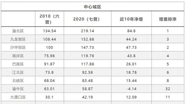 重庆这座城市焕发着巨大的活力,人口也是重庆最亮眼的一张王牌!今天,我们先看一下重庆主城9区人口,根据最新普查,渝北区人口达到了2191493人,近十年增量达到了84万之多,因此渝北区增量第一!此外,渝中就有点落寞,出现了负增长!2010年,渝中区是63.9万人,如今,渝中区常住人口为588717人,约为58.78万人!