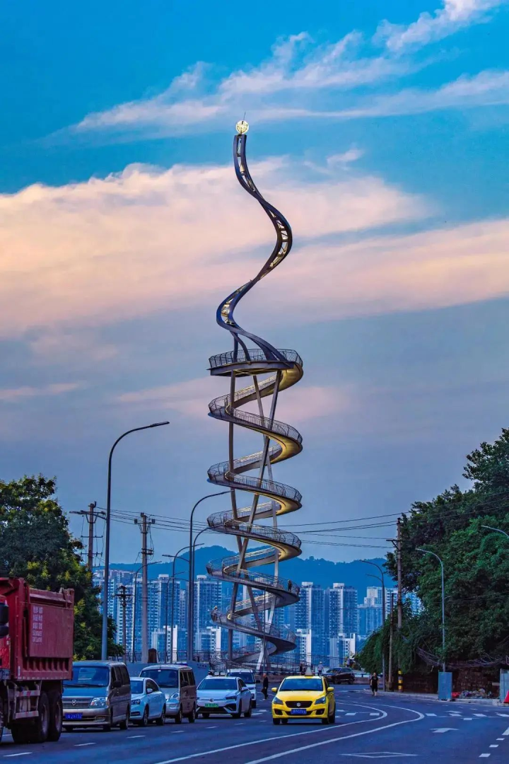 长江灯塔塔高64米,与长江6400公里总长呼应,崖底距塔尖99米,像一根“飘带”环绕呈螺旋楼梯,自下而上伸展。