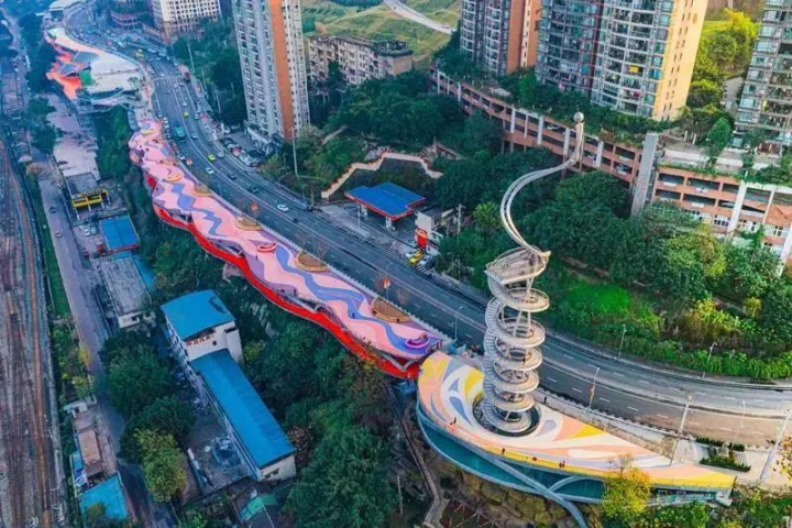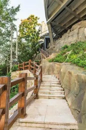 崖顶彩道建在倾斜度为60°至90°的坡坎崖上,犹如一条镶在海岸上的花边,顶部彩虹步道,可供市民休闲健身,同时也是开阔的观景平台,游客可180°观长江壮丽画卷。