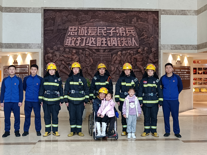 当街道和社区的志愿者来看望他时,他说出了自己的心里话——想去石坪桥消防站看望消防员们。这个心愿很快就被满足了。去年,他参观了消防站,穿上消防服和消防员们一起合影,一起吃饭,为消防员们送上了平安锁扣。妈妈王多菊则为消防员们送上了寓意平安的钻石画。