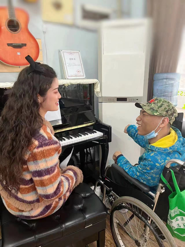 如今街道和社区不仅满足了孩子拥有新轮椅的心愿,还想法设法帮他找了两位音乐老师,教他乐谱知识,帮助他实现自己的音乐梦想。