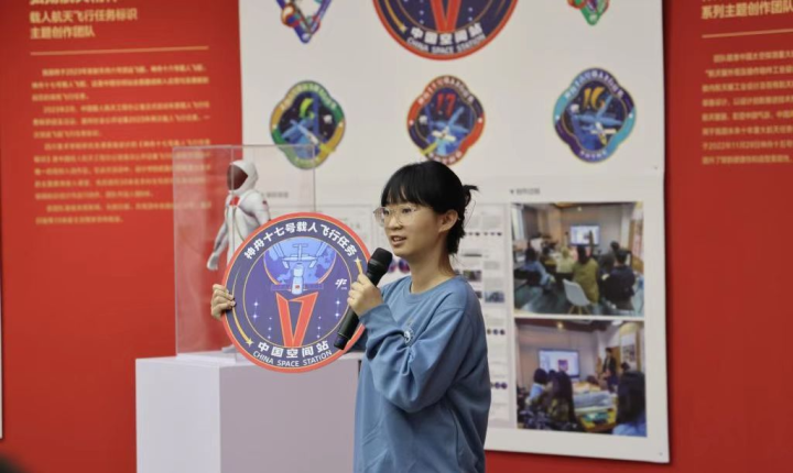 据了解,这枚区级特色章的设计者可不得了,她是神舟十七号载人飞行任务标识的设计者。她设计的这枚飞行任务标识,将出现在神舟十七号航天员胸前,随着飞船登上太空,寓意着我国载人航天事业蓬勃发展的态势。她,就是四川美术学院2022级研究生——谭昊瑜。