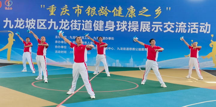 近年来,九龙街道老年人服务资源配置更加合理,服务内容更加丰富,老年朋友们的获得感、幸福感、安全感明显增强。街道10个社区组建了12支健身球操队伍,多次在全国和市区比赛中斩获佳绩。街道被命名为首批“重庆市银龄健康之乡”,健身球操队被命名为首批“重庆老年人体育健身示范团队”,盘龙新城社区被命名为首批“市级银龄健康之家”,其他社区均成功创建“区级银龄健康之家”。
