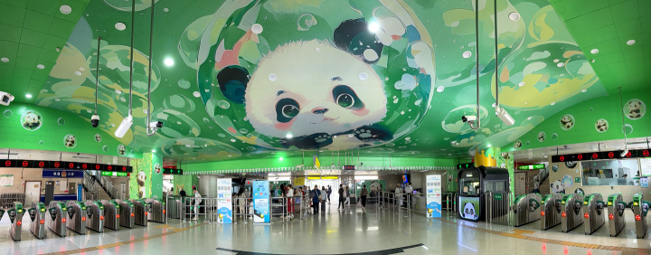 走进车站大厅,绿色天花板宛若一个巨大的穹顶,可爱的小熊猫被一只大大的泡泡包裹着,周围还漂浮着许多轻盈梦幻的小泡泡,彩绘画面跃然眼前,给人以身临其境的立体观感。从站厅到站台,从售票机、闸机门到立柱、楼梯,随处可见的泡泡和熊猫元素相映成趣,为通勤路途增添了几分童趣与惊喜。