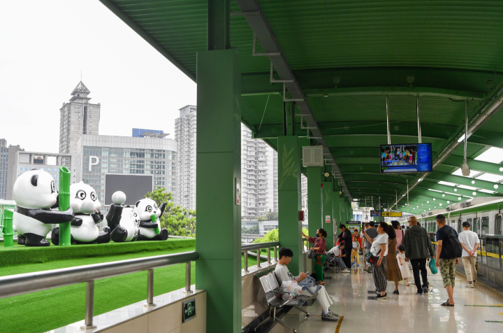 沿着人行梯步往上,在站台的观景露台处,6只憨态可掬的熊猫雕塑错落分布在苍翠竹影间。它们或抱竹酣眠,或吹泡泡玩耍,或笑着看着来往人群……这一幅悠然自得的画卷,让往来行人不禁驻足拍照留念。