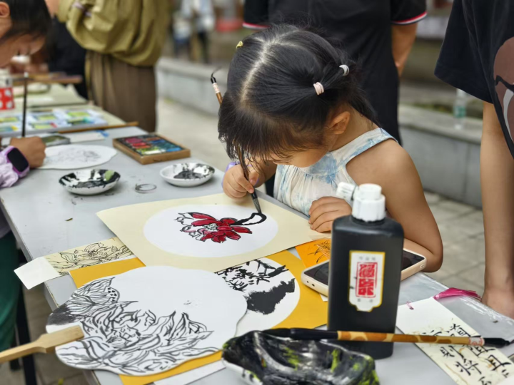 国画雅韵区内,弥漫着淡淡的墨香。居民们围坐在桌前,在专业人员的指导下,专注地在宫扇、卡纸上创作传统国画。李大爷平时就对国画感兴趣,但一直没有机会学习,这次活动让他圆了“国画梦”。他认真地勾勒着线条,笑着说:“没想到我也能画出这么好看的画,还认识了好多有共同爱好的邻居!”大家一边创作,一边交流心得,原本陌生的邻里关系在艺术的感染下变得亲密无间。