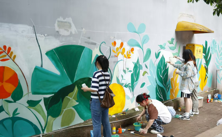 启动仪式后,四个特色艺术劳动工坊同步开放,成为社区里一道道亮丽的风景线。在墙绘共创区,美术学院的学生们手持画笔,与热情的居民们并肩作战。他们一边耐心地向居民讲解绘画技巧,一边共同构思着墙绘的图案。一位小朋友在学生志愿者的鼓励下,小心翼翼地在墙面上涂抹着颜料,他兴奋地说:“以前只在电视上看过这样漂亮的画,没想到今天我也能参与画在自己家小区的墙上!”在大家的共同努力下,原本灰暗斑驳的墙面逐渐被一幅幅充满童趣与创意的涂鸦填满,小区瞬间焕发出新的生机。