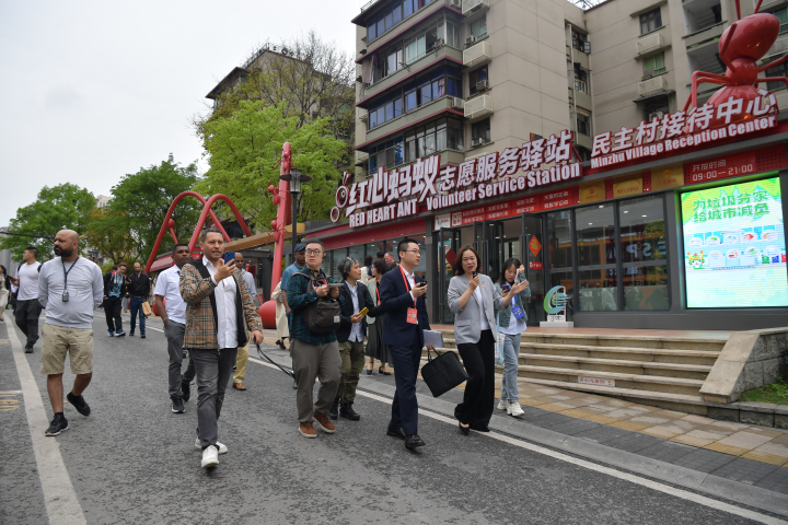 在红心蚂蚁志愿服务驿站,驿站志愿者详细介绍了新就业群体党建、志愿服务及社区帮扶等便民服务举措。该驿站在凝聚新就业群体力量、服务社区居民方面发挥着重要作用。惠民巧匠坊内,采访团一一记录拍摄传统手艺人为居民理发、配钥匙的场景。民情坝坝茶搭建起倾听民意、解决民生实事的沟通桥梁,有效推动社区问题的解决,在这里,采访团聆听了此处收集居民安装电梯的建议并得以实施的故事。采访团走进民主村社区党群服务中心和民主村健康服务中心,实地感受民主村社区15分钟高品质生活服务圈带来的便利服务。采访团随后来到民主村社区食堂,这里采取“公益+惠民”运营模式,在为老年人提供优惠助餐服务的同时,也吸引众多游客和青年前来就餐,展现社区生活的烟火气与活力。采访团还参观了化粪池智能监控,智能监控接入区运管服平台,动态监测有毒有害易燃易爆气体,超标自动报警处置,守护社区安全。大家走进社区会客厅,感受民主氛围与社区变迁,接着大家来到城市驿站、半坡聚落和生态停车场,直观体验到城市驿站转运生活垃圾、为居民提供便利,半坡聚落串联商圈,生态停车场盘活闲置地缓解居民停车难的场景。