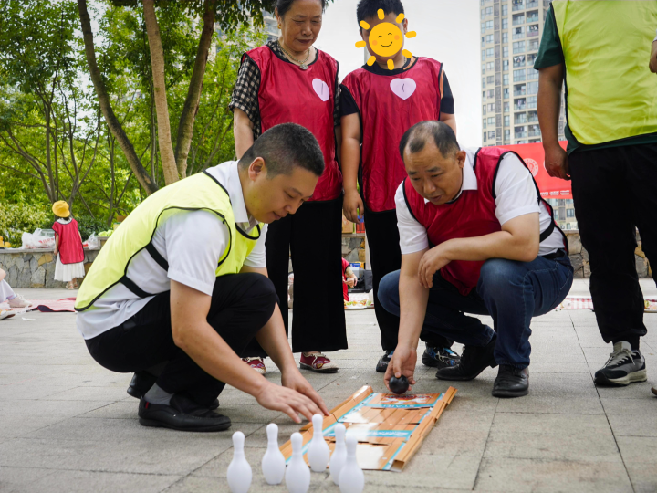 在随后的趣味互动环节,各个家庭身着色彩缤纷的分队服,以小组形式投身于六大趣味游戏之中。“击鼓传花”成为孩子们展示自我的小舞台,随着鼓声起落,孩子们大方地进行自我介绍,洋溢着自信的光彩;“蒙眼互助闯关”里,家长与孩子相互信任、紧密配合,携手跨越重重障碍;“珠行万里”“保龄球比赛”等团队游戏,则让大家在合作中碰撞出智慧的火花,现场笑声、欢呼声此起彼伏。游戏不仅让孩子们尽情释放压力,更让亲子间的情感在互动中得到了深度升华。