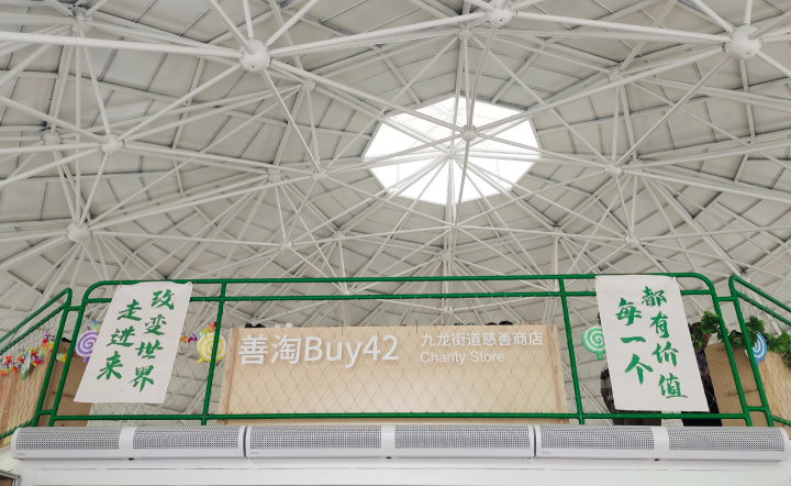 如今,这把撑起的“公益大伞”内部别有洞天:门口悬挂着“走进来改变世界”“每一个都有价值”的标语,附近居民和过路市民前往参观购物,成为新晋打卡点。
