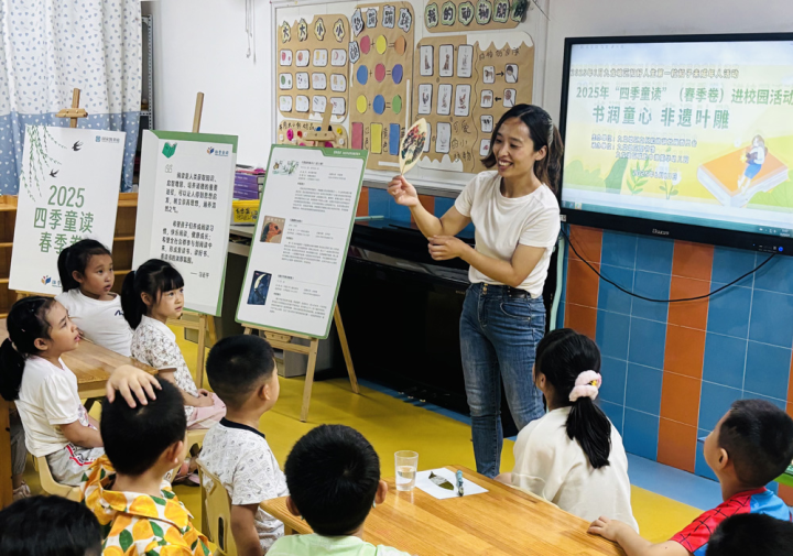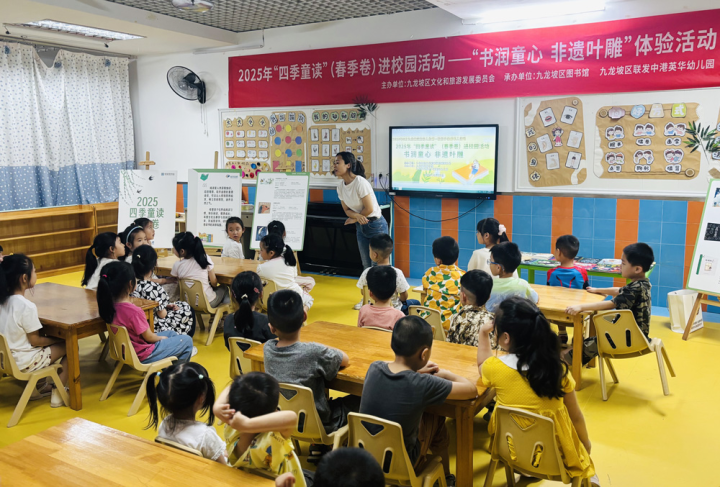九龙融媒讯(记者 范坤民)为助力儿童早期阅读习惯养成,推动公共文化服务与教育深度融合,6月9日下午,由九龙坡区文化和旅游发展委员会主办,九龙坡区图书馆、九龙坡区联发中港英华幼儿园联合承办的2025年“四季童读”(春季卷)进校园活动——“书润童心 非遗叶雕”体验活动在联发中港英华幼儿园精彩上演,带领孩子们穿梭于书香与非遗交织的奇妙世界。