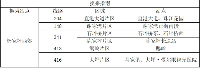 该线路在杨家坪西郊、桃花溪、动物园及轨道交通大堰站等重要节点设置了便捷换乘点。通过这些换乘点,患者可快速转乘前往直港大道、谢家湾、石坪桥、大坪、石桥铺等区域的公交线路,实现全区主要居住区与九龙坡区人民医院新院区的无缝衔接。