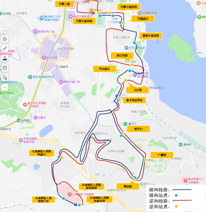 逆向:九龙坡区人民医院首末站、九龙坡区人民医院住院部、九龙坡区人民医院路口、高进路、广厦城、滩子口、育才实验学校、上江城、珠江花园、万福路口、万象大道东段、万象大道中段、万象二路、万象大道中段。