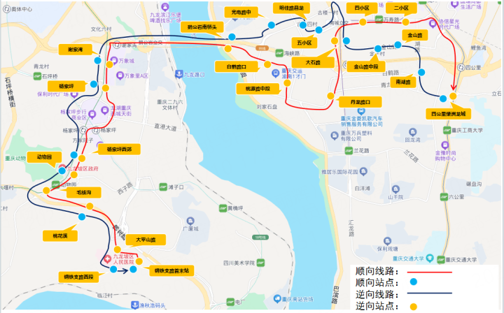 逆向:九龙坡区人民医院首末站、九龙坡区人民医院住院部、九龙坡区人民医院路口、桃花溪、毛线沟、动物园、九龙坡区人民医院杨家坪A院区。
