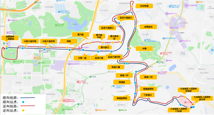 顺向:渝高香洲二郎医院、火炬大道中段、火炬大道东段、恒胜、火炬一路、云龙大道、云龙大道中段、云龙大道路口、龙泉路北、水碾、轨道大堰、杨渡二村、杨渡路、杨渡路南段、九龙坡区人民医院门诊部、九龙坡区人民医院首末站。