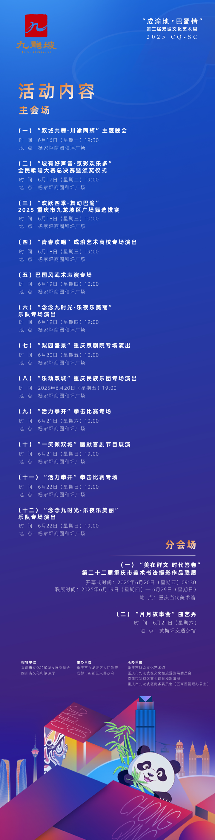 记者了解到,本届双城文化艺术周由重庆市文化和旅游发展委员会、四川省文化和旅游厅指导,重庆市九龙坡区人民政府与成都市新都区人民政府联合主办,将于2025年6月16日至22日期间在九龙坡区和坪广场隆重举行。活动将立足双城深厚的在地文化根基,重磅推出七大特色展演、三大主题赛事、两大会场联动,覆盖传统艺术、当代创作、群众文化、体育竞技等多个领域,全面展现巴蜀文化创新传承与成渝文艺共生共融的新篇章,以跨越地域、协同联动的展演形式给两地市民带来高品质的文化艺术视听盛宴。