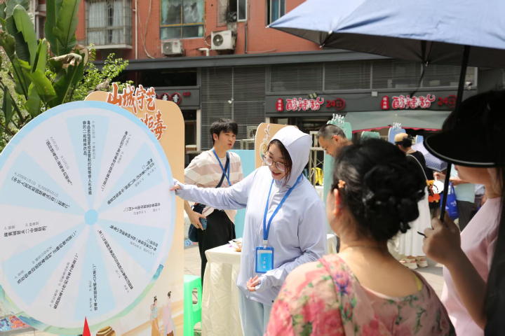 在黄桷坪涂鸦一条街色彩明快的建筑下,非遗漆艺摊位前排起长队。“每把禁毒漆扇需经历10余道工序”,非遗代表性传承人手把手指导社区里的阿姨们滴入大漆颜料,轻轻转动扇柄,一幅独一无二的禁毒扇面就制作完成了。