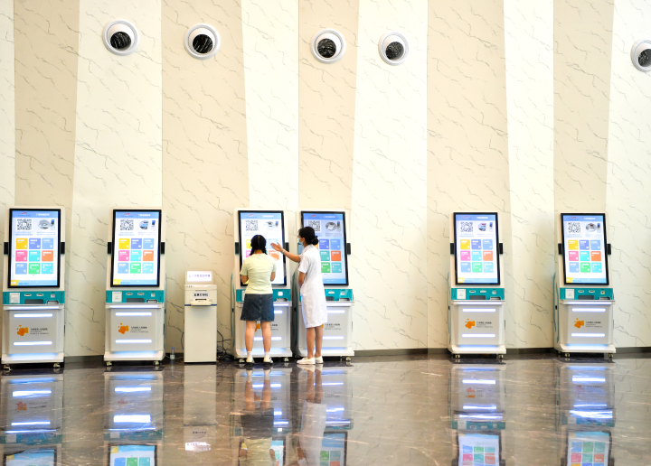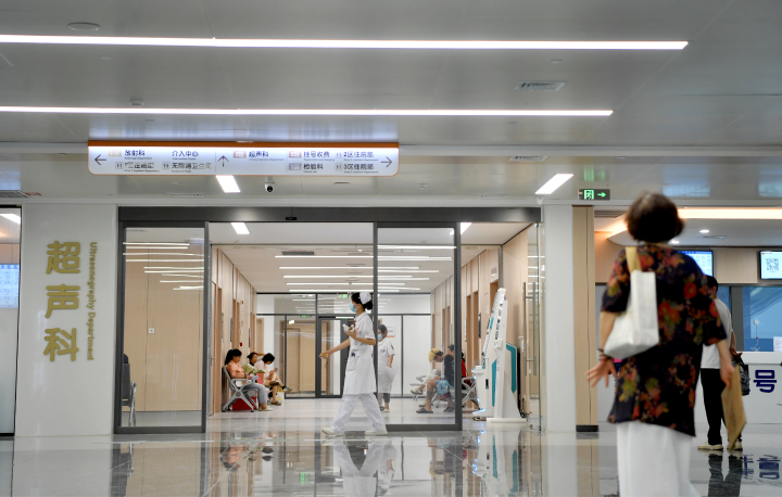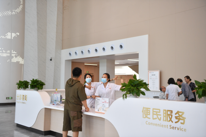 早上9点,门诊大厅内,1200平方米的空间运行高效有序。针对传统就医“三长一短”(挂号、缴费、检查排队时间长,看病时间短)痛点,新院区创新布局。
