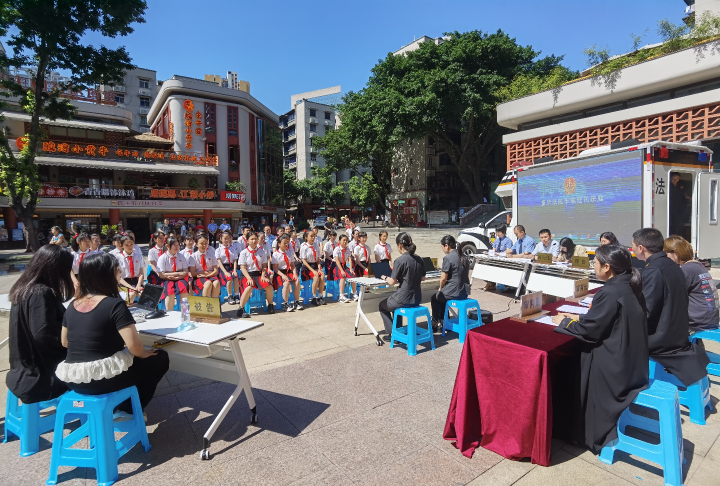 九龙融媒讯 (记者 冉冉 摄影报道)近日,区法院将“车载便民法庭”开进谢家湾街道民主村社区,巡回审理一起未成年人文身侵权案件,并邀请重庆谢家湾学校40余名师生和上百名社区群众现场观摩,让大家“沉浸式”感受法律的威严和公正,“零距离”参与“九久护苗”少审团队普法互动。