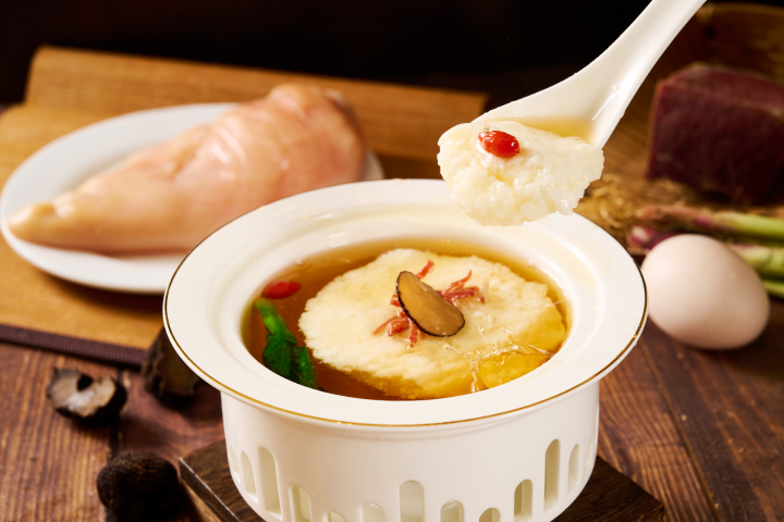 菜品介绍:将精选鸡胸肉剔去筋膜,用刀背捶成细蓉,加入蛋清、高汤混合,搅拌至细腻,再倒入高汤中,小火慢煮,形成豆花状,最后再加入少许盐、胡椒粉等调味,保持清淡鲜美。一碗鸡豆花,考验的是厨师的精湛技艺,火候多一秒则散,少一秒则生,这口嫩滑,是功夫更是艺术。以肉仿素,以简驭繁,这碗“假”豆花,以清汤为魂、鸡蓉作骨,看似平淡,却让鲜味层层绽放。