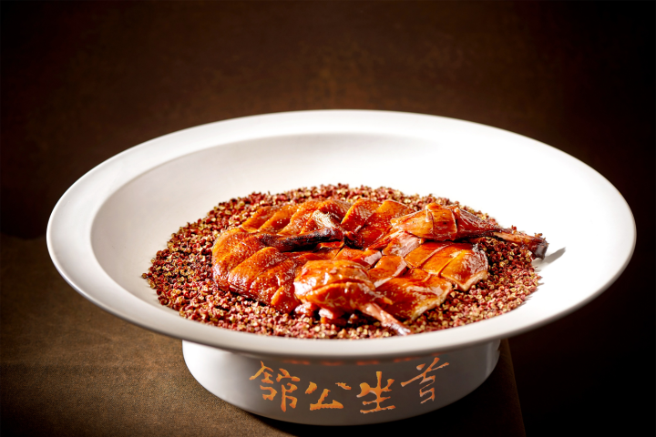 菜品介绍:香茅大红袍焗腊板鸭口感独特,鸭肉紧实而不失柔嫩,每一口都能感受到花椒的独特香气和麻味,呈现咸香而不腻的口感,鸭肉的鲜美和花椒的辛辣味瞬间侵入味蕾,带来一种幸福感。