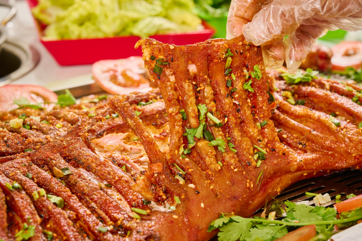菜品介绍:遵循“天时、地利、人和”的食材哲学,精选生长60天、体重18斤的生态乳猪。这种黄金生长周期的乳猪,肌纤维细腻如绢,脂肪层薄如蝉翼,形成完美的3:7肥瘦比。配合选用优质花椒、海椒作为刺激味蕾的调料,再配以清热、杀菌、助消化的中药材为主要原料,构建起麻辣鲜香与养生智慧并存的味觉体系。全程拒绝添加剂,让“生态”二字恒久地镌刻在每一只烤乳猪的身上。