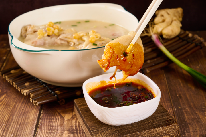 菜品介绍:精选新鲜猪后蹄,焯水后去掉脚趾间的硬皮与粗毛,再刷洗干净。文火大锅炖制,待猪蹄软糯即可。精选饱满豌豆浸泡数小时后文火熬制,其作为蹄花汤的绝佳“伴侣”一同装盘,富含胶原蛋白,入口即化,肉质鲜美多汁,汤料浓郁飘香。