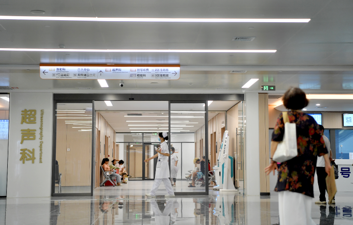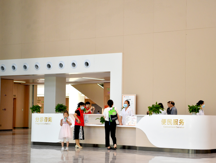 步入新院区,人性化设计与科技感扑面而来。门诊大厅自助服务区配备多台智能终端,患者可便捷完成挂号、报告打印等操作,身着“红马甲”的“生命花”志愿者随时提供一对一协助。院内导诊系统精准高效——清晰的图示、关键节点的志愿者引导、二三层增设的收费窗口,加之诊室与检查室的科学布局,共同实现“一站式”便捷就医。