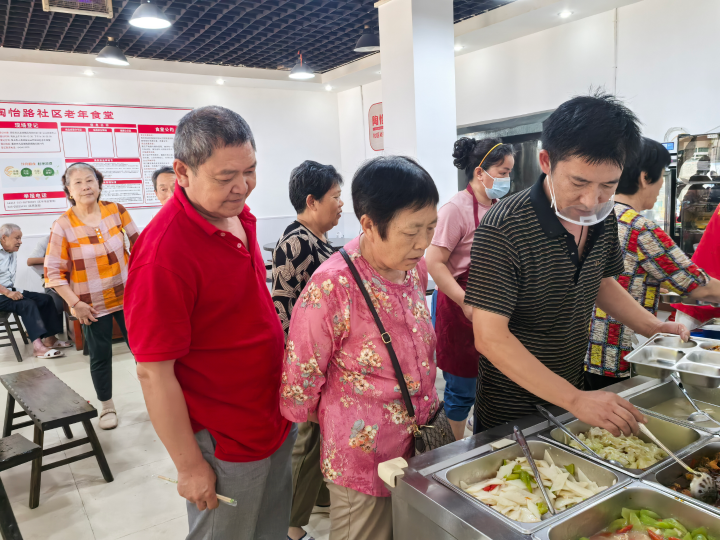 “为切实解决老年人的用餐难题,同时也为他们提供一个社交和情感交流的平台,我们积极完善社区养老服务体系,多方协作打造了这家社区老年食堂。”据陶怡路社区工作人员余春凤介绍,陶怡路社区老年食堂用餐面积约60平方米,布局精巧合理,分为登记处、菜品米饭自助区、就餐区、餐盘回收区、透明式厨房、卫生间等区域,可同时容纳50位老人就餐。