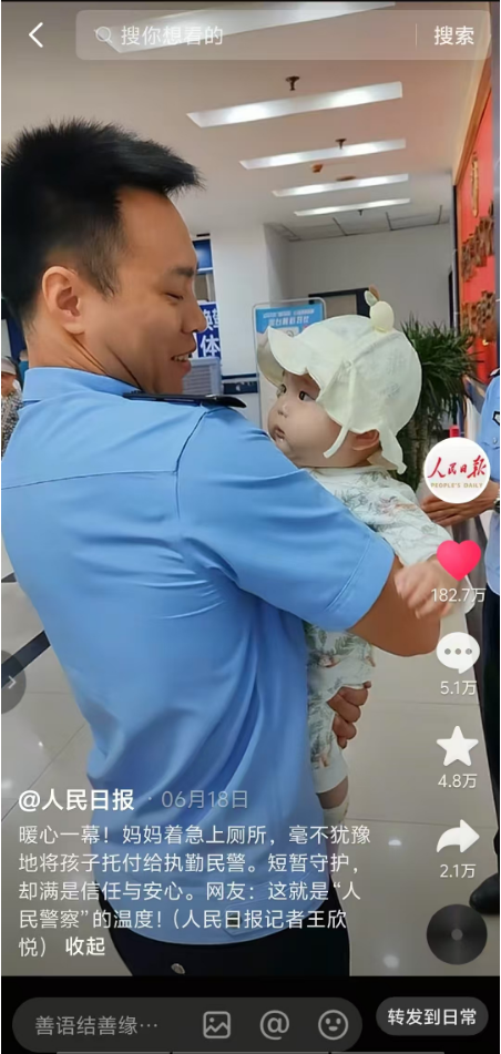 九龙融媒讯 (记者 冉冉)日前,区公安分局华岩派出所大厅内,一位年轻妈妈因着急如厕,将怀中两岁幼童托付给值班民警。民警自然接过孩子的温情一幕被群众拍下,视频经《人民日报》、新华社等央媒的视频账号转发后迅速走红,网友纷纷称赞:“这就是群众对人民警察最深的信任。”