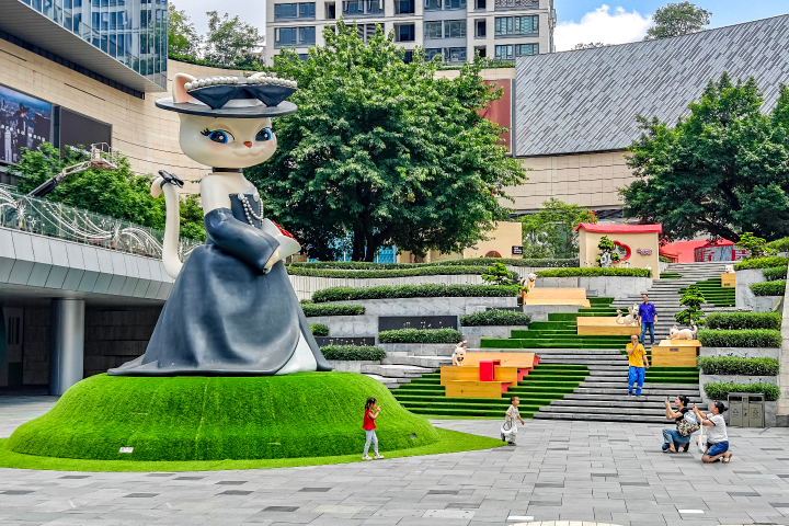 万象城北区古树广场,家长带着小朋友打卡探索趣味十足的猫咪街区。