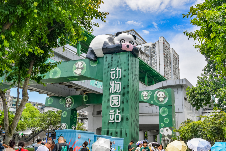 重庆轨道交通2号线动物园站外,萌趣熊猫装置吸引游客目光,驻足拍照打卡。