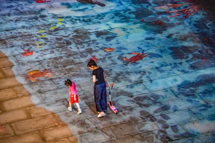 每当夜晚来临,九龙渡口旁都会亮起一片梦幻“海滩”,为夏夜增添乐趣。