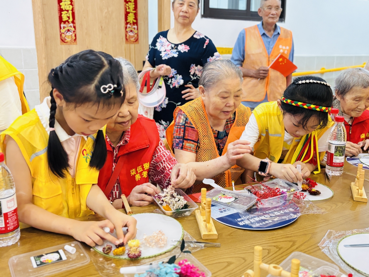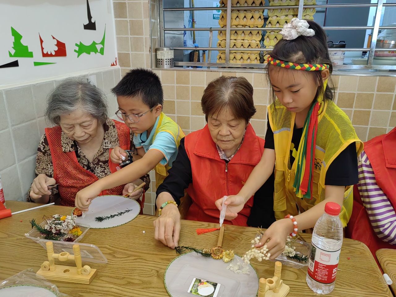 在手工制作环节,老少携手共同创作团扇作品。孩子们耐心地帮助爷爷奶奶挑选图案、粘贴装饰,一边制作一边聆听老人们讲述往昔岁月。活动最后,小志愿者们不仅帮忙整理场地,还贴心地为每位老人送上营养牛奶,并叮嘱他们注意身体健康。