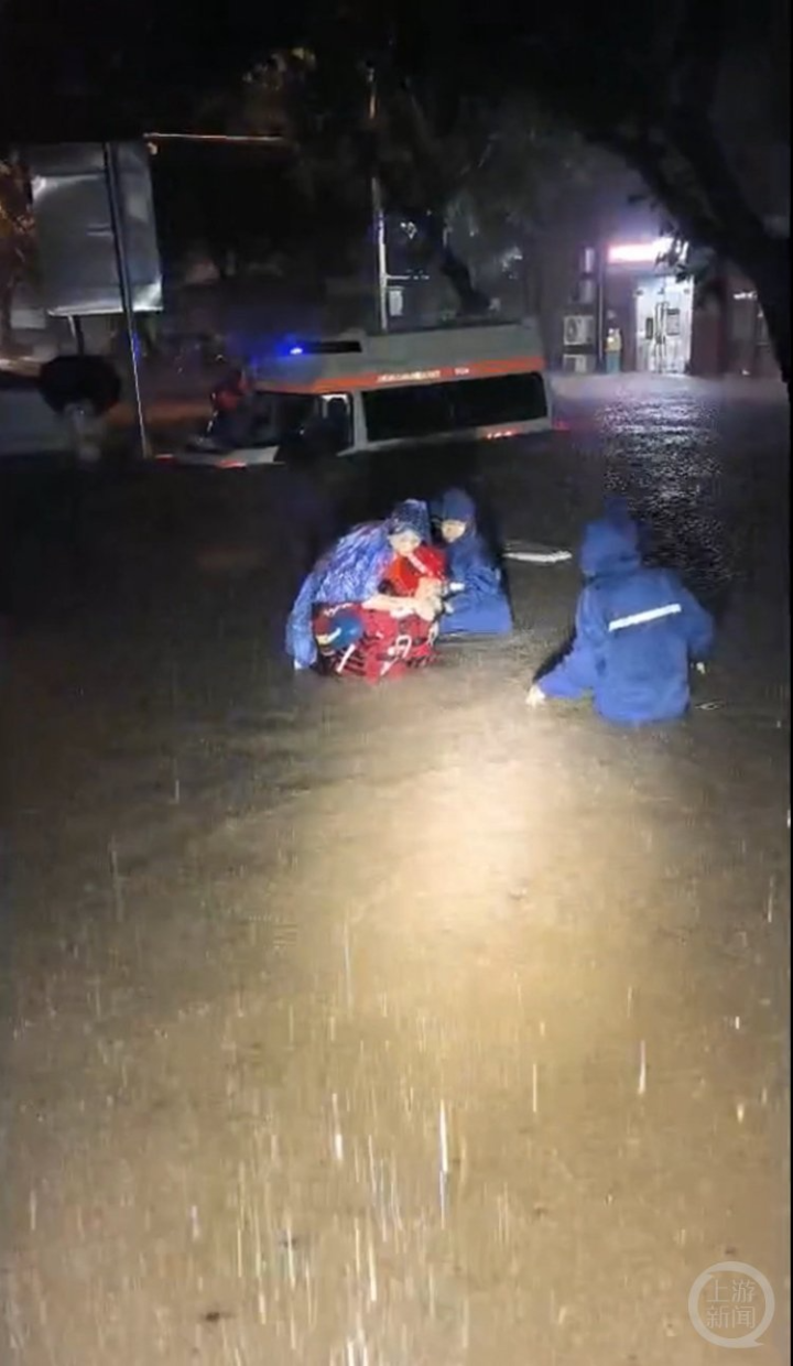 杨渡村建工九建公司积水严重,员工家属区内,家属无法自行将瘫痪老人带出至安全区域,消防救援人员抱着老人,蹚过齐腰深的积水将其转移至安全区域,并带领家属区内其余被困人员转移。