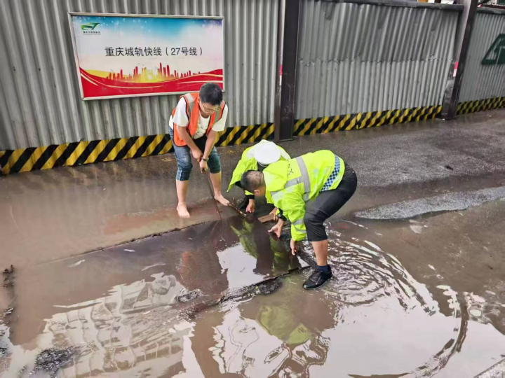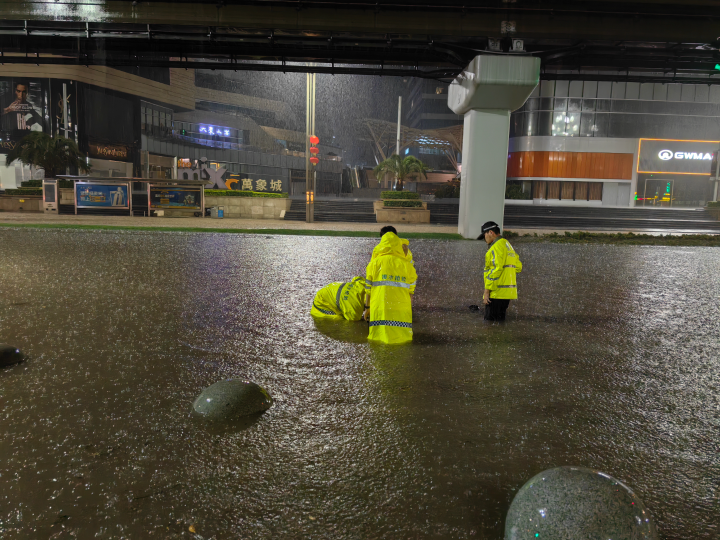 暴雨导致渝州路街道科园一路一施工路段处严重积水,存在交通安全隐患,在周边晚高峰执勤的交巡警歇台子大队民警在积水中来回穿梭疏导交通,引导过往车辆选择安全道路绕行,同时联系工地负责人到场,民警辅警与施工人员在积水中摸索,合力打开井盖排水,蹚水清理杂物,加速排水,全力保障道路安全畅通与群众出行安全。