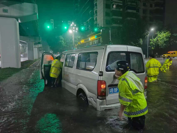 ▲民警深夜在谢家湾正街积水路面推车脱困。