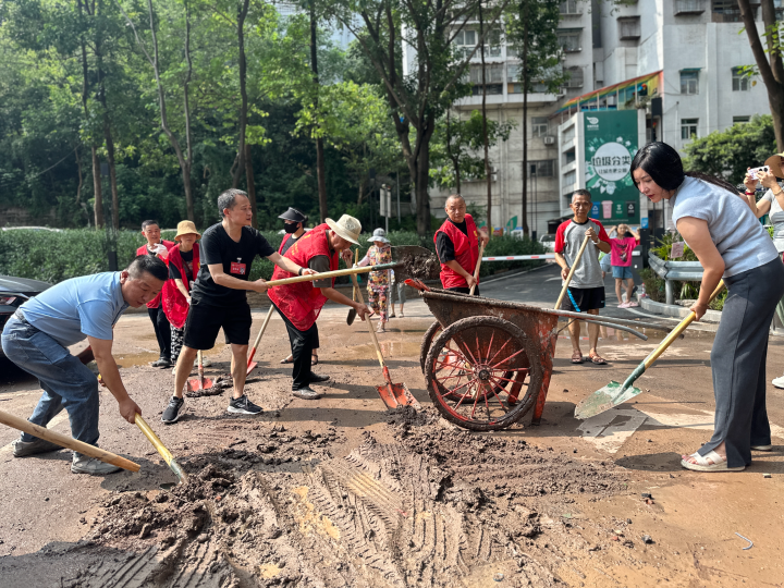 7月12日早上8时,黄桷坪街道九龙湾社区铁路一村17号附近,30余名志愿者手持铁锹、扫把等工具,紧张有序地开展清淤工作。