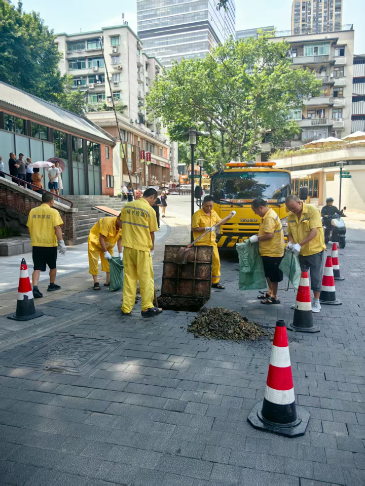 现场作业按 "疏通 + 清掏" 双线推进:一组手持铁钩、竹片,同时利用高压水枪,对数十米至百余米长的管网分段疏通,重点处理周边餐饮场所冲刷入管的油污结块;另一组则专注于清掏随雨水冲进雨水口的树叶和垃圾等。