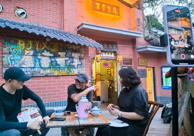 当天的节目录制现场简单朴素,仅有一张木桌、三把木椅、三杯茶水、三把自制蒲扇,但在军哥书屋红砖外墙、铁制店招、涂鸦木板的衬托下,充满了怀旧复古的文艺氛围。