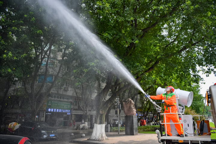 记者在渝州路看到,道路两旁行道树的叶片上布满了密密麻麻的虫洞,有些叶片几乎被蛀空了叶肉,只剩薄薄的网状叶脉,一粒粒呈扁圆小米状的虫卵紧紧黏附在枝干上,时不时地还有虫体掉下。随后,绿化工人利用高压喷雾车向行道树喷洒药剂,确保药剂尽可能覆盖到更高区域。