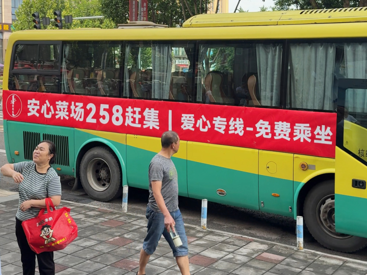 菜场里,刚买完菜的张阿姨正准备乘车回家,她的购物袋里装满了鸡蛋、蔬菜和水果。“我住西香郡,以前买多点东西就担心拎不动,现在出菜场就能上车,到好又多路口下车,几步路就到家,一点不累。”她举起手里的袋子给记者看,“你看这菜多新鲜,多亏了这趟专线车,以后赶场我天天来!”