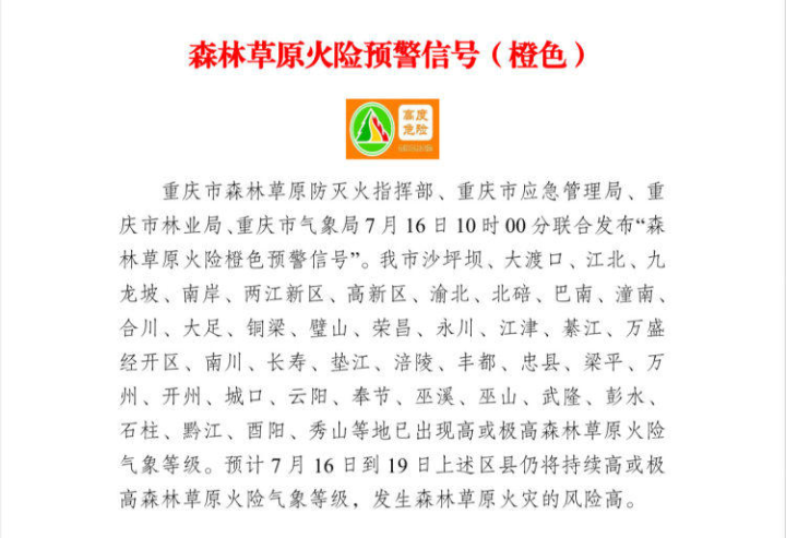 7月16日10时,重庆市森林草原防灭火指挥部、重庆市应急管理局、重庆市林业局、重庆市气象局联合发布“森林草原火险橙色预警信号”。