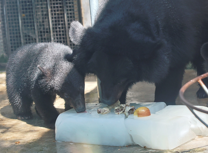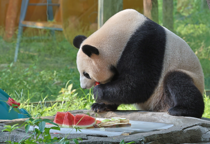 深受大家喜爱的大熊猫们自然是享受了特别待遇。喷淋降温设备为它们带来丝丝清凉,高温时节,特制冰砖更是它们的夏日玩伴。只见萌宝们,时而在喷淋下欢快地 “洗澡”,感受着喷雾带来的清爽;时而抱着切好的西瓜大快朵颐,汁水顺着嘴角流下,模样憨态可掬,引来众多游客围观,大家纷纷呼喊着“多吃一点”。玩累了就坐在木桌前,一边啃着竹子,一边抱着冰块,享受着这份夏日专属的清凉与惬意。