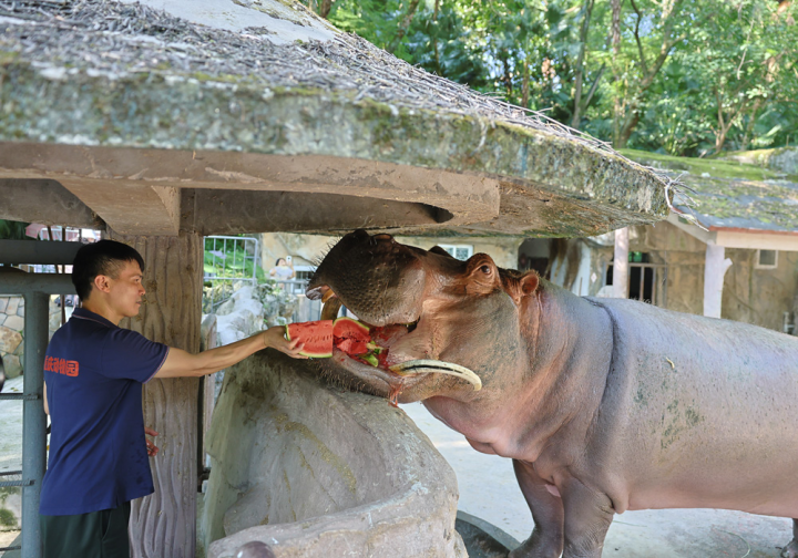 重量级动物河马也有自己的消暑妙招。它们时而悠然自得地在水池里泡澡,只露出脑袋,享受着池水的清凉;时而上岸,张开血盆大口,吃下整片的西瓜,吃得津津有味,让人忍俊不禁。